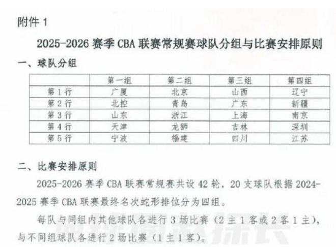 新赛季常规赛一共有42轮,20支球队分为4组,每组5支球队,按照上赛季的季后赛最终战绩排名顺序进行合理安排。常规赛阶段每支球队与同组内的其他球队进行3场比赛,1主场2客场或者2主场1客场;每支球队与不同组的其他球队进行2场比赛,为1主场1客场。新赛季常规赛的排名依旧是采用积分制,胜1场积2分,负1场积1分,弃赛或者弃权0分。根据CBA公司下发的《2025-26赛季CBA联赛常规赛分组与比赛安排原则》,分组情况如下: