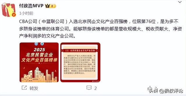 北京时间9月25日,根据媒体人付政浩的报道,CBA公司(中篮联公司)入选北京民企文化产业百强榜,位居第76位,是为数不多跻身该榜单的体育公司。能够跻身该榜单的都是营收规模大、税收贡献大、净资产净利润多的文化产业公司。