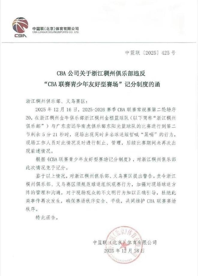 2025年12月16日,2025-2026赛季CBA联赛常规赛第二轮场序20,在浙江稠州金牛俱乐部浙江稠州金租篮球队(以下简称"浙江稠州俱乐部")与广东宏远华南虎俱乐部东阳光篮球队的比赛进行到第二节剩余5分21秒时,现场出现同时多名球迷短暂喊"黑哨"的行为,现场工作人员对此情况及时进行制止,管理,后续比赛期间未再次出现前述情况。