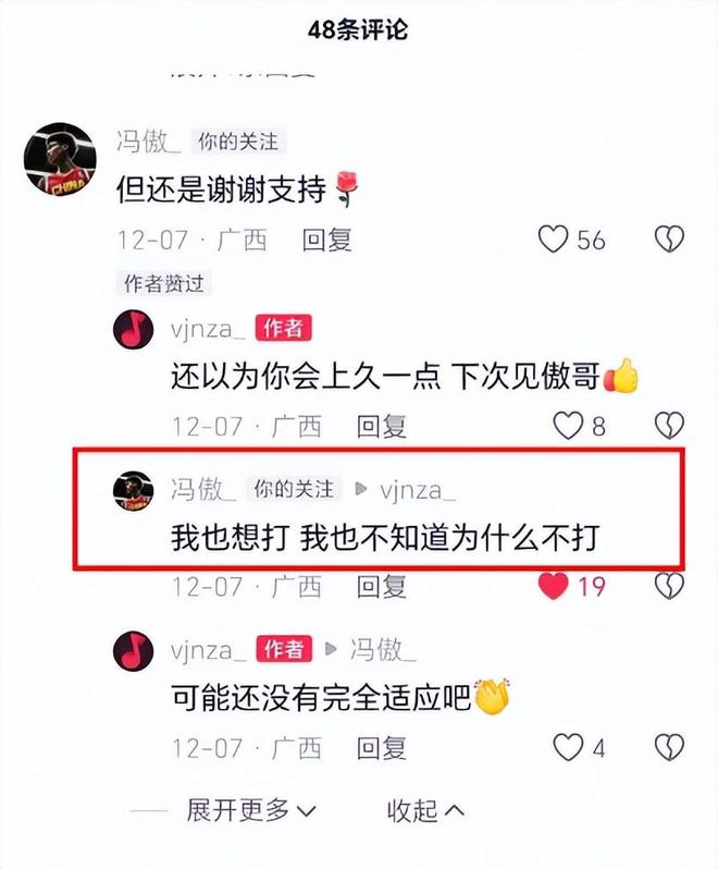 有网友做了一段冯傲打球的视频,冯傲在下面留言道:“我也想打,我也不知道为什么不打。”