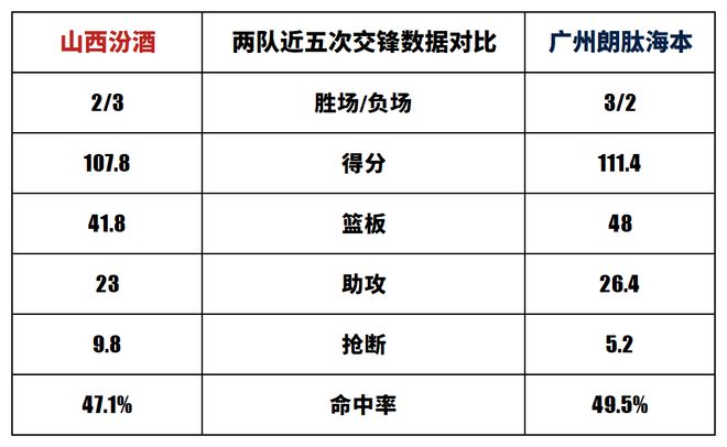 山西汾酒与广州朗肽海本历史上一共交手44次,山西汾酒23胜21负。上赛季两队交手2次,山西汾酒2胜0负。