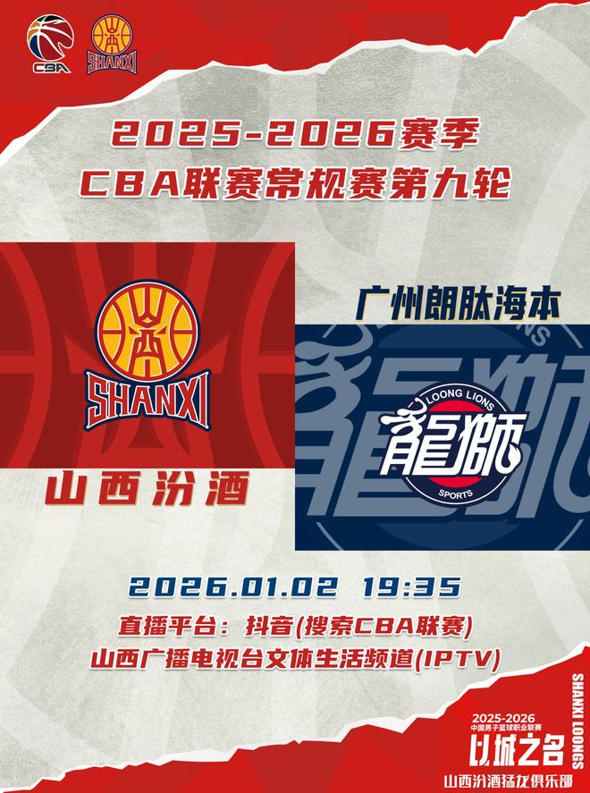 北京时间2026年1月2日19:35,2025-2026赛季CBA联赛常规赛第九轮继续进行,山西汾酒迎来新年首战,主场对阵广州朗肽海本,球迷观众可以通过抖音(搜索CBA联赛)、山西广播电视台文体生活频道(IPTV)观看比赛实况,与我们一同观看这场新年大战!