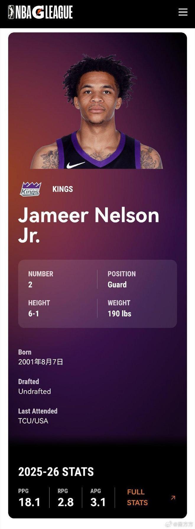 小贾马尔-尼尔森此前效力于国王下属发展联盟球队,他在发展联盟场均得到18.1分3.1助攻。