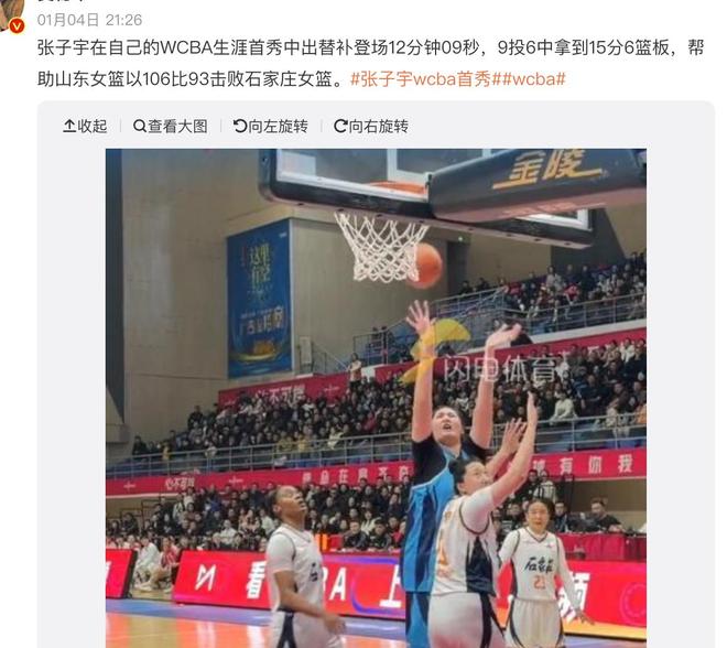 各位球迷都知道,女姚明张子宇自从出道以来,一直备受很多球迷的关注,大家也都期待她能够在将来的国际赛场当中大杀四方。而如今她的职业生涯也不断刷新着记录。在新赛季WCBA比赛到来的时候,张子宇也是压哨签约了山东女篮,并且在最近迎来了首场比赛。