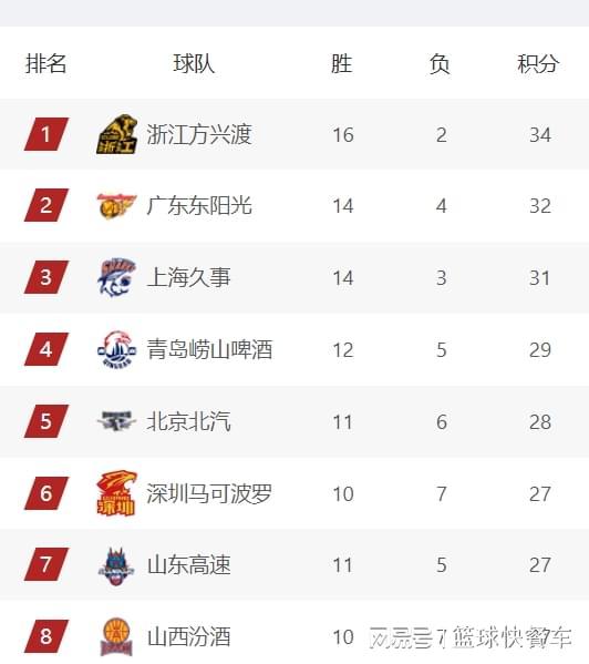 11冠王广东队则排在积分榜第2名。这一轮比赛,广东队客场挑战吉林队。尽管是客场作战,不过,广东队最终还是以119-98战胜吉林队,成功收获两连胜。凭借着这一场大胜,广东队也将战绩提升到14胜4负,成功反超上海队,上升至积分榜第2名。而上海队,他们则以14胜3负的战绩,暂居积分榜第3名。由于少赛一轮的缘故,上海队在排名上稍微吃亏。排在第四名则是青岛队。