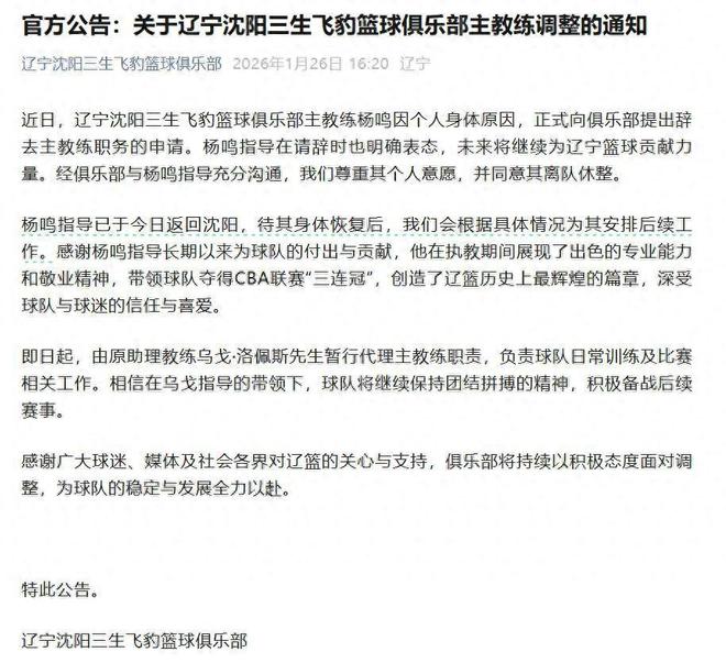 1月26日,辽宁男篮俱乐部官宣杨鸣由于身体原因辞去了主教练一职。