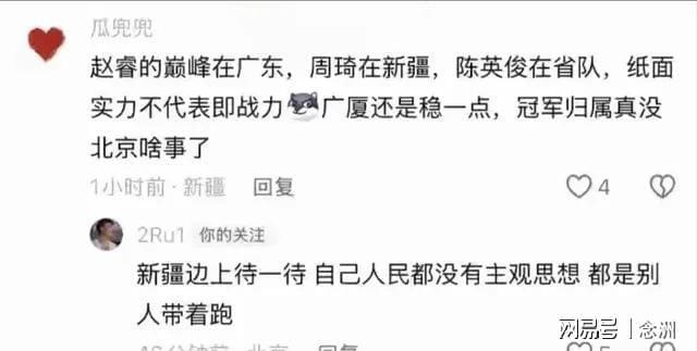 还有新疆的网友写道:赵睿的巅峰在广东,周琦在新疆,陈英俊在省队,纸面实力不代表即战力,广厦还是稳一点,冠军归属真没北京啥事了。”赵睿回复道:“新疆边上待一待,自己人民都没有主观思想,都是别人带着跑。”