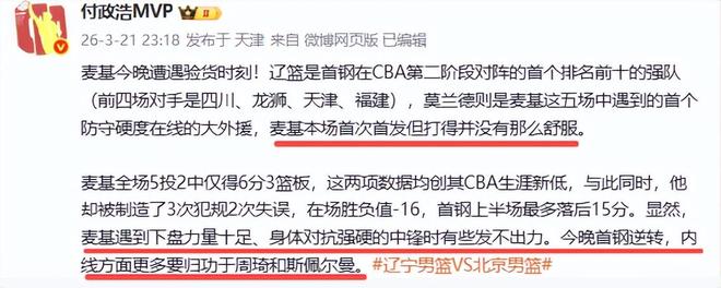 下半场许利民基本弃用了麦基,特别是第四节完全不用他,主打另一位大外援斯佩尔曼,全场比赛麦基仅6分3板,在场输16分。而辽宁队的莫兰德全场砍下9分和11个篮板,他真的是完爆麦基。媒体人付政浩也不认可麦基,他说“莫兰德是麦基这五场中遇到的首个防守硬度在线的大外援,麦基本场首次首发但打得并没有那么舒服。”付政浩 还指出,“麦基遇到下盘力量十足、身体对抗强硬的中锋时有些发不出力。今晚首钢逆转,内线方面更多要归功于周琦和斯佩尔曼。”