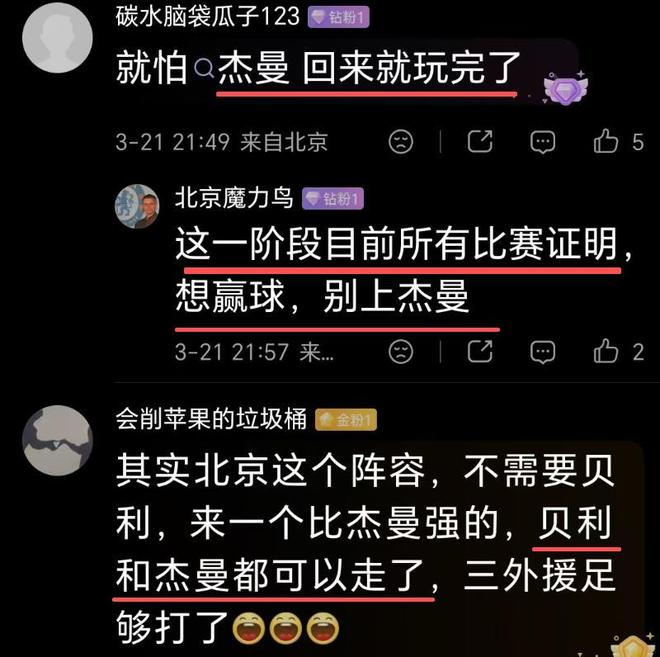 昨晚赛后杰曼居然被北京球迷开会,他们说昨晚赢球正是缺了杰曼,若是他在应该赢不了比赛。为什么这样说?因为杰曼在的话,主帅许利民肯定是用杰曼主打末节,效果肯定没有国产双后卫好。球迷说,“第四节真的不用死磕杰曼 ,上斯佩尔曼可以给两位拉开空间他们就打得更舒服了”、“这一阶段目前所有比赛证明想赢球,别上杰曼”。这场胜利也找到了脓包,球迷说“脓包找到了,杰曼!”。甚至有些球迷主张裁掉杰曼:“其实北京这个阵容,不需要贝利,来一个比杰曼强的,贝利和杰曼都可以走了,三外援足够打了”。