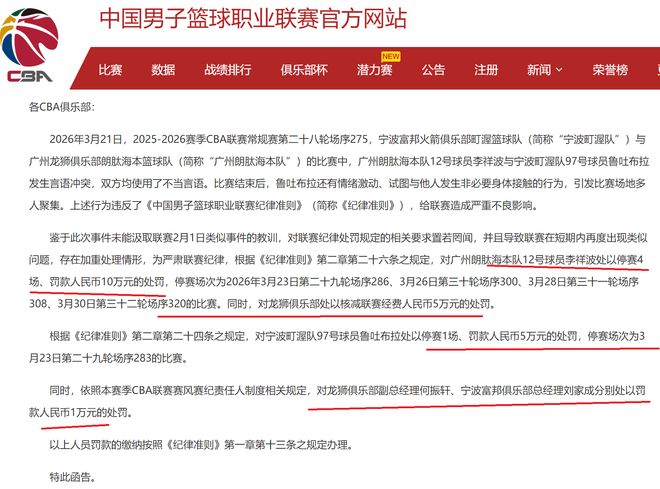 CBA开出1份大罚单!对李祥波、鲁吐布拉等4人进行了重罚