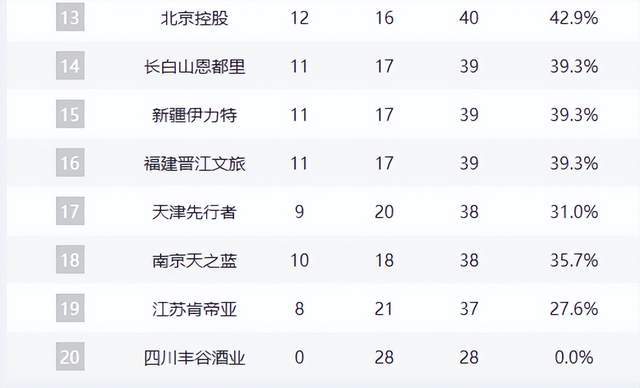 中游集团竞争激烈:宁波队14胜14负胜率持平,广州与北控同为12胜16负,暂列第12、13位,成为季后赛“守门员”;吉林、新疆、福建三队11胜17负,仍保留理论冲击季后赛的可能。