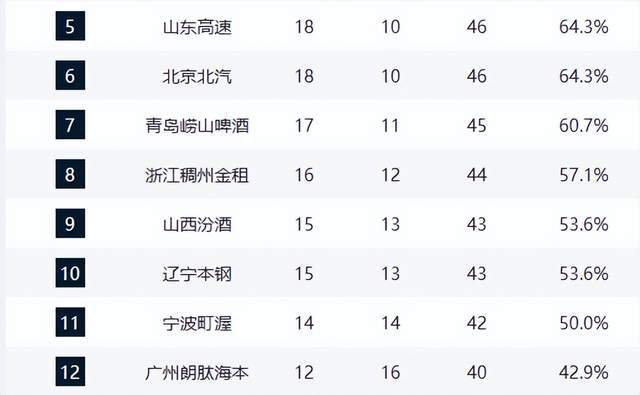 北京队与山东队同为18胜10负,分列第五、第六,下轮若双双取胜,极有可能联手反超广东,冲击前三。季后赛席位争夺进入白热化:青岛队17胜11负稳居第七,浙江队16胜12负位列第八,山西与辽宁同为15胜13负,虎视眈眈,前八席位悬念未解。
