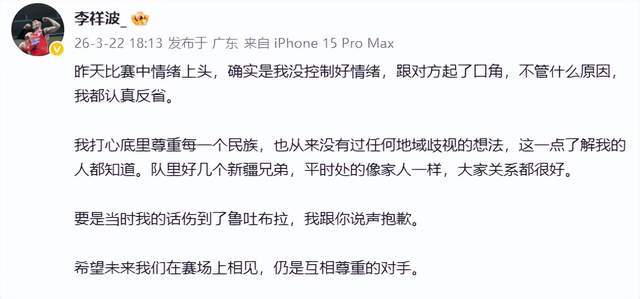 事件发酵后,李祥波于22日通过社交媒体发布致歉声明:“我打心底尊重每一个民族,从未有过任何地域歧视的想法。若我的言语伤害了鲁吐布拉,我向你真诚道歉。”其措辞诚恳,明确将事件归因于“情绪上头”,并主动承担沟通责任,展现出球员应有的担当。