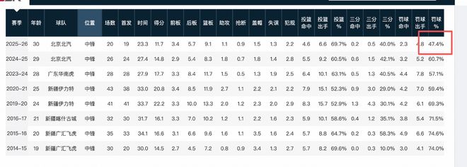 一场比赛出现罚球8中0,连续两场比赛合起来17个罚球不进,连续罚丢12个罚球。哪怕是放在一向以罚球糟糕的奥尼尔身上,也可谓是非常之罕见。而职业生涯早期,罚球命中率还有74%的周琦,本赛季罚球命中率,已经跌到47.4%。