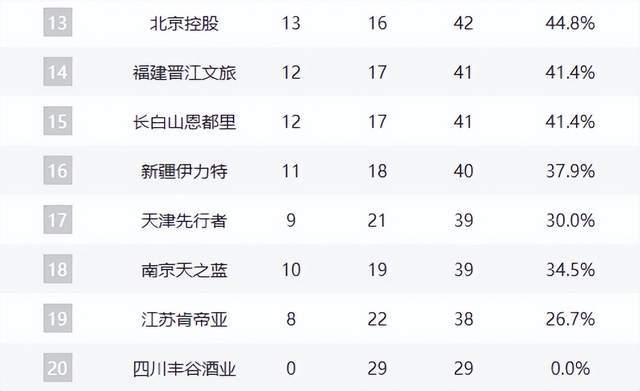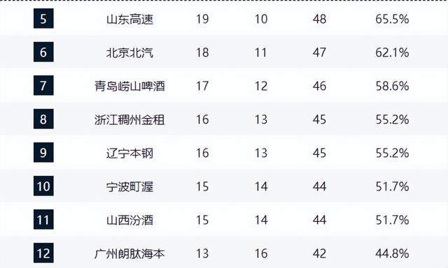 青岛队(17胜12负)、浙江队(16胜13负)分列第七、第八,近期连败后优势缩水。辽宁队以16胜13负升至第九,近8战7胜,展现出强劲复苏态势,八强席位触手可及。宁波队(15胜14负)、山西队(15胜14负)紧咬季后赛边缘。