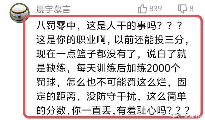 “周琦这罚球0/8,是职业球员?真是笑话。就这进取心,在NBA饮水机都看不明白真是有原因的。”;“职业球员,上场14罚中5,这场更离谱,8罚全飞,我平时不打篮球,5罚至少也能进一个”“8中0,和街溜子有啥区别?”……