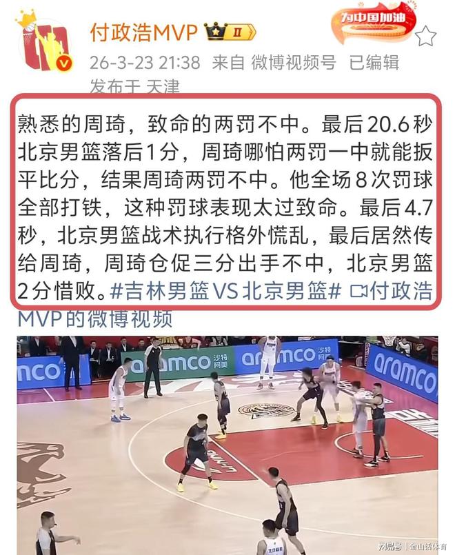 针对周琦在罚球线糟糕的表现,著名媒体人付政浩赛后发文表示“熟悉的周琦,致命的两罚不中。最后20.6秒北京男篮落后1分,周琦哪怕两罚一中就能扳平比分,结果周琦两罚不中。他全场8次罚球全部打铁,这种罚球表现太过致命。最后4.7秒,北京男篮战术执行格外慌乱,最后居然传给周琦,周琦仓促三分出手不中,北京男篮2分惜败。”。