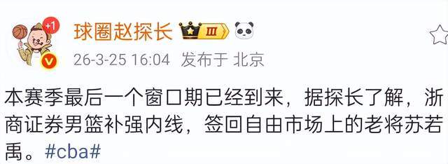 根据媒体人报道,CBA名将苏若禹确定会在这个窗口期加盟浙江广厦,他重返老东家效力,对于浙江广厦来说,这是一次非常好的补充,特别是5号位,以苏若禹的能力来说,还是会比吴骁要好一些,这也是一个信号,浙江广厦本赛季的目标就是全力卫冕总冠军。