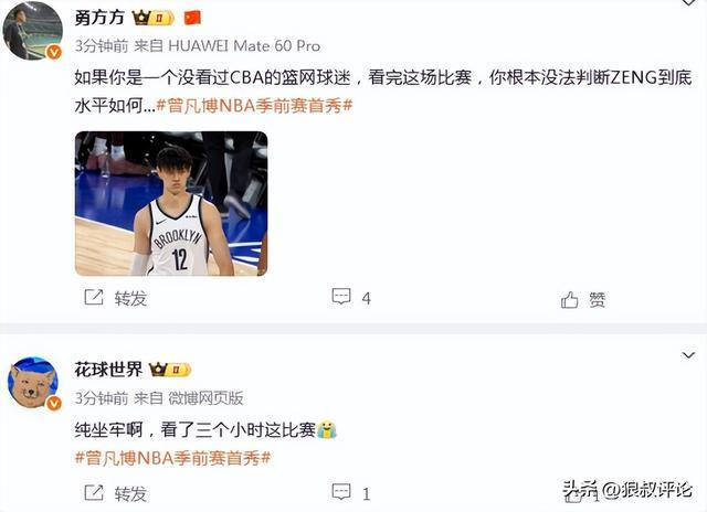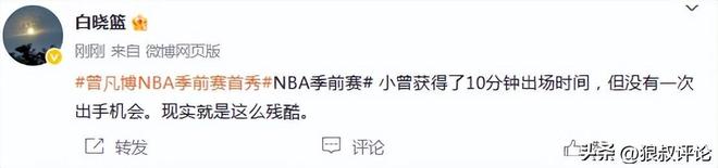 媒体人苏群发文点评:曾凡博这么好身体条件,我看篮网都把他注册成2米11了,还是需要更好的训练。季前赛第一场打10分钟,连出手机会都没有,也不能全怪边缘球员争饭碗太独。下一场篮网应该会给他差不多时间,但不是靠加时赛达到10分钟。对曾凡博来说,虽然还没有达到NBA的要求,但这张体验卡得来也不容易,好在还年轻,希望这不是终点,而是起点。