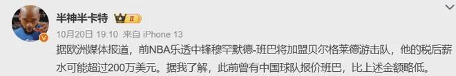 据国内媒体人透露,有CBA球队同样有意签下班巴,但报价比贝尔格莱德游击队提供的薪资低一点。