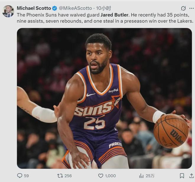 此前一直跟随太阳队打季前赛,曾在对阵湖人的比赛中独砍35分7篮板9助攻。