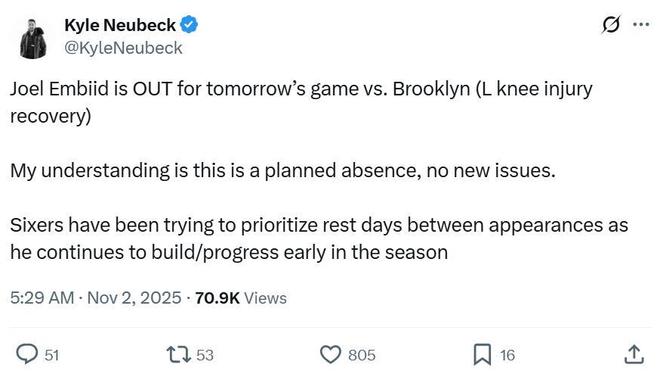 本场比赛开始前,76人队记Kyle Neubeck曝出恩比德因为左膝伤病管理缺席本场比赛,同时专门强调恩比德伤病没有出现新的状况,本场缺席本就在计划之中。