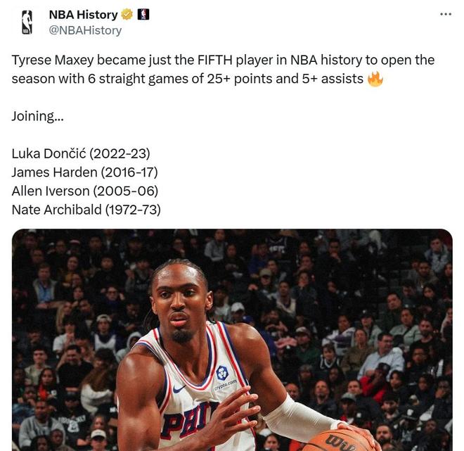 其中马克西轻松拿下26+6+7数据,开季前6场连续送出至少25+5助表现,成为NBA历史上第5位交出这一壮举的球员,前四人分别是东契奇(22-23)、哈登(16-17)、艾弗森(05-06)和阿奇博尔德(72-73)。