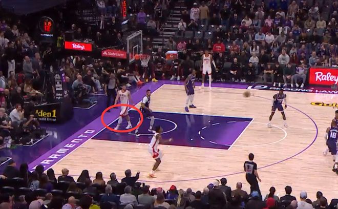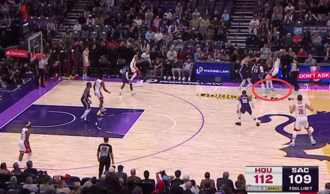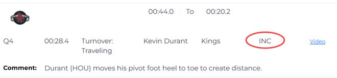 第三次也是漏判,发生在距离第四节结束还有28.4秒,杜兰特在创造空间时移动中枢脚,这是一次漏吹的走步违例,火箭获利,国王吃亏。
