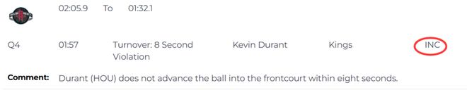 第一次是漏判,发生在距离第四节结束还有1分57秒,裁判报告指出,火箭的杜兰特未在8秒内将球推进前场。这是一次漏吹的8秒违例,火箭获利,国王吃亏。