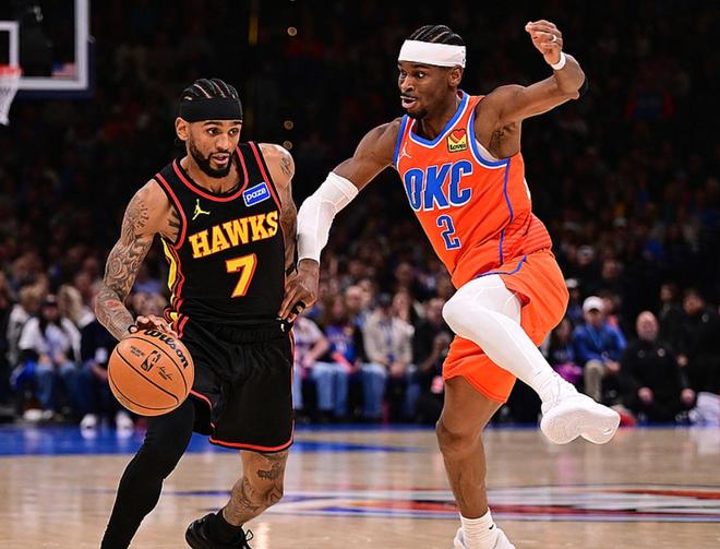 雷霆主场迎战老鹰,老鹰少了特雷杨、波津、杰伦约翰逊3个核心,雷霆少了哈滕,上半场比赛老鹰表现不俗,半场战罢领先4分,下半场比赛雷霆展现出了优势,最终雷霆以以11分优势赢下比赛。亚历山大24中15得到39分5板6助2断,切特14中9得到24分9板2助3帽,杰伦17中8得到20分9板7助,老鹰方面沃克24中11(三分14中6)得到30分4板5助2断,奥孔古16中8得到26分14板6助。