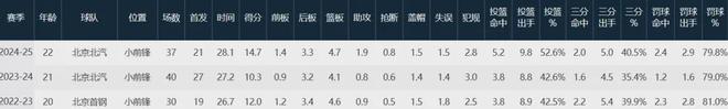 上赛季征战CBA的曾凡博,常规赛出战37场首发21次,场均亮相28.1分钟贡献14.7分4.7板1.9助1.5帽,两项命中率52.6%与40.5%;季后赛出战5场首发1次,场均亮相28.8分钟,砍下15分4.2板1助1断1.6帽,两项命中率56.3%与43.3%。
