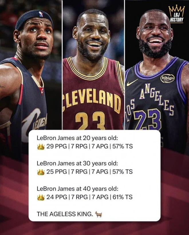 数据显示,詹姆斯20-29岁时场均29分7篮板7助攻,真实命中率57%;30-39岁时场均25分7篮板7助攻,真实命中率仍保持57%;而40岁至今,他场均能得到24分7篮板7助攻,真实命中率反而提升至61%。