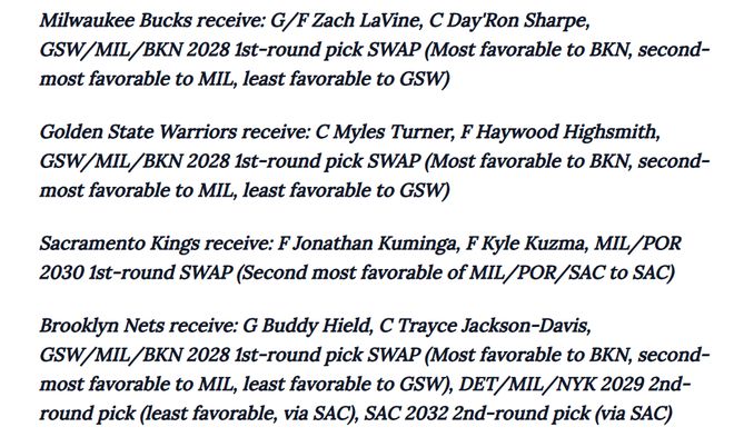 - 密尔沃基雄鹿得到:扎克·拉文、戴罗恩·夏普、2028年首轮选秀权互换权(涉及勇士/雄鹿/篮网三队,篮网优先级最高,雄鹿次之,勇士最低)