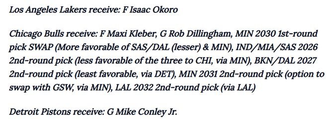 - 芝加哥公牛:马克西·克莱伯、迪林厄姆、2030年首轮选秀权互换权(涉及马刺/独行侠/森林狼三队,森林狼优先级最高)、2026年次轮选秀权(涉及步行者/热火/马刺三队,公牛优先级最低,通过森林狼获得)、2027年次轮选秀权(涉及篮网/独行侠/活塞三队,公牛优先级最低,通过活塞获得)、2031年次轮选秀权(通过森林狼与勇士的选秀权互换获得)、2032年次轮选秀权(通过湖人获得)
