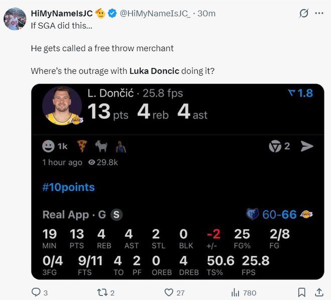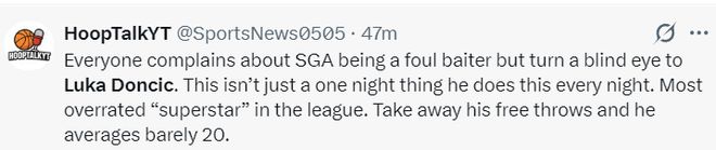 美媒HoopTalkYT:每个人都抱怨SGA是一个罚球贩子但对东契奇视而不见,东契奇并不是只有一个夜晚罚球多,他其实是联盟最被过度吹捧的超巨之一,如果不考虑他的罚球场均就20分左右。