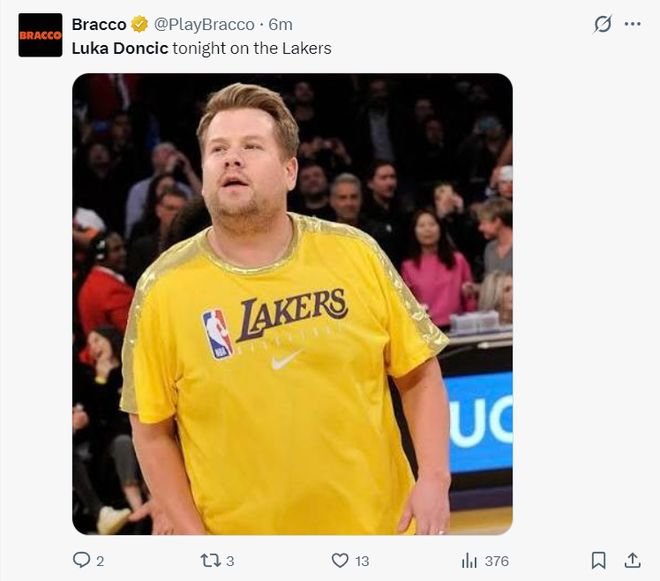 东契奇在场湖人的防守效果再一次让人无奈,从领先11分到落后4分只用了4分钟不到,美媒Bracco已经晒出东胖子的图老嘲讽东契奇了,半场东契奇8中2+三分4中0拿13分4篮板4助攻2抢断4失误。