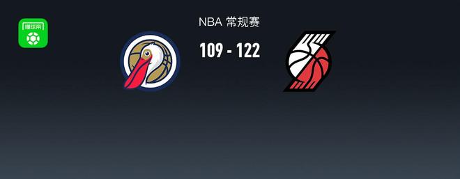 第四节鹈鹕普尔拿下12分,开拓者卡莱布-乐福拿下12分,最终鹈鹕109-122不敌开拓者