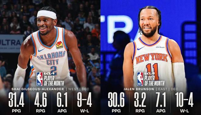 来自NBA官方的最新消息,2025年12月份的月最佳球员公布,西部亚历山大,东部布伦森。