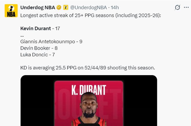 杜兰特这种表现其实已经稀疏平常,他已经连续17个赛季场均25分以上,算上本赛季他也比扬尼斯9次、布克8次、东契奇7次更多。