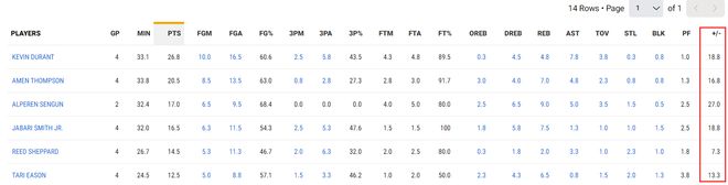 这一波四连胜,杜兰特场均33.1分钟,拿到26.8分4.8篮板7.8助攻0.3抢断0.8盖帽,命中率60.6%,三分命中率43.5%,正负值+18.8,四场比赛合计正负值+75火箭最高,就连火箭球迷追捧的伊森也只有+53。