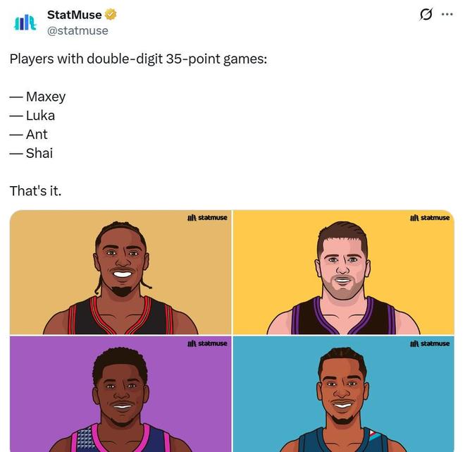 这是本赛季马克西第11次单场轰下35+表现联盟第二,仅次于东契奇的12次,亚历山大与爱德华兹10次并列第三。