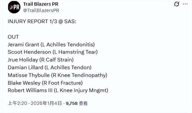 北京时间1月4日,开拓者官方更新了球队的伤病报告。今日背靠背对马刺的比赛,格兰特(左脚跟腱炎)、亨德森(左腿筋撕裂)、霍勒迪(右小腿扭伤)、利拉德(左跟腱伤病)、塞布尔(右膝肌腱炎)、韦斯利(右脚骨折)和罗威(左膝伤病管理)均将缺席。其中,罗威按惯例背靠背缺阵,杨瀚森的机会又来了。