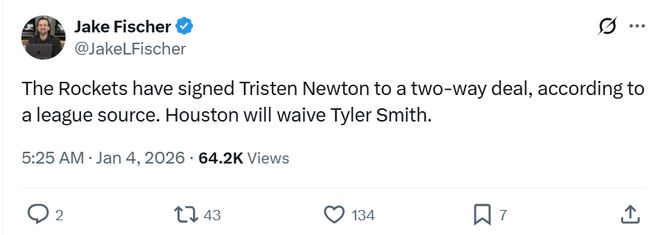 根据记者Jake Fischer报道,火箭队完成一签一裁,与后卫特里斯滕-牛顿签下双向合同,并为其裁掉前锋泰勒-史密斯腾出位置。