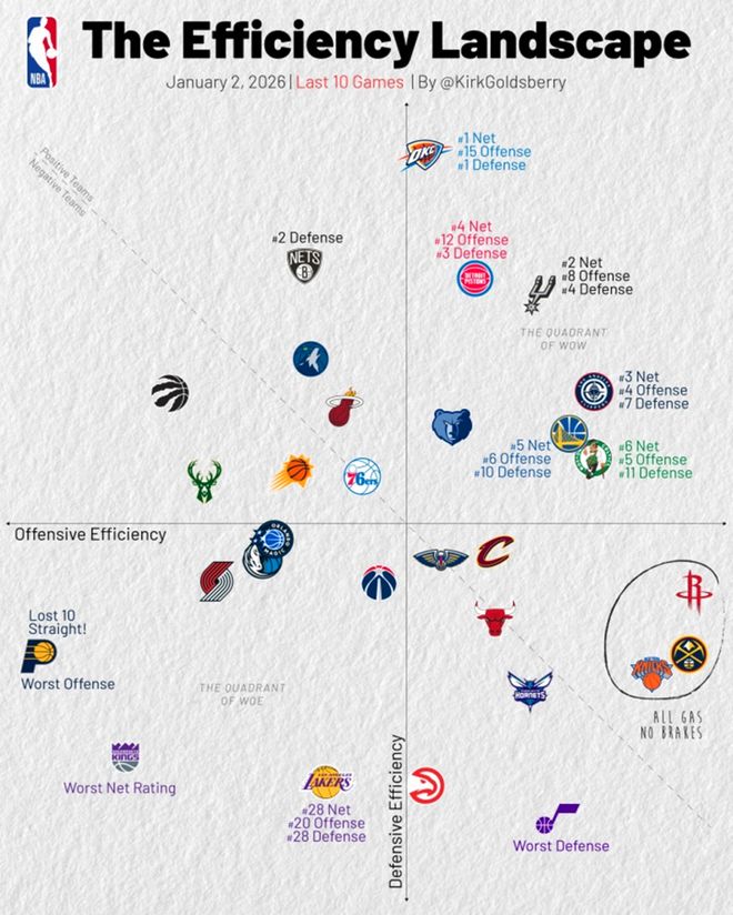 更何况火箭队目前上升势头明显,过去10场进攻效率联盟第一,同时开季至今,火箭队56.5%的篮板率与+11.4的篮板净胜均创造NBA新的历史纪录。