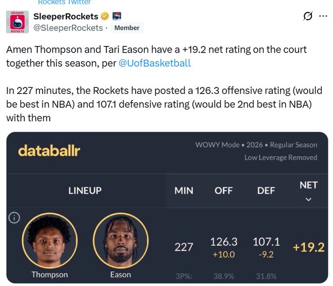 开赛至今,当伊森首发出战时,火箭队5战全胜,伊森与阿门同时在场时,进攻效率126.3联盟第一,107.1的防守效率联盟第二,净效率高达+19.2。