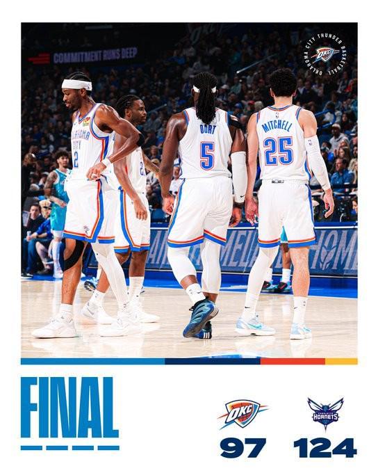 北京时间今日,在NBA常规赛中,卫冕冠军俄克拉荷马雷霆队在主场爆出大冷门,他们以97-124惨败于东部弱旅夏洛特黄蜂队,遭遇本赛季的第二次连败。