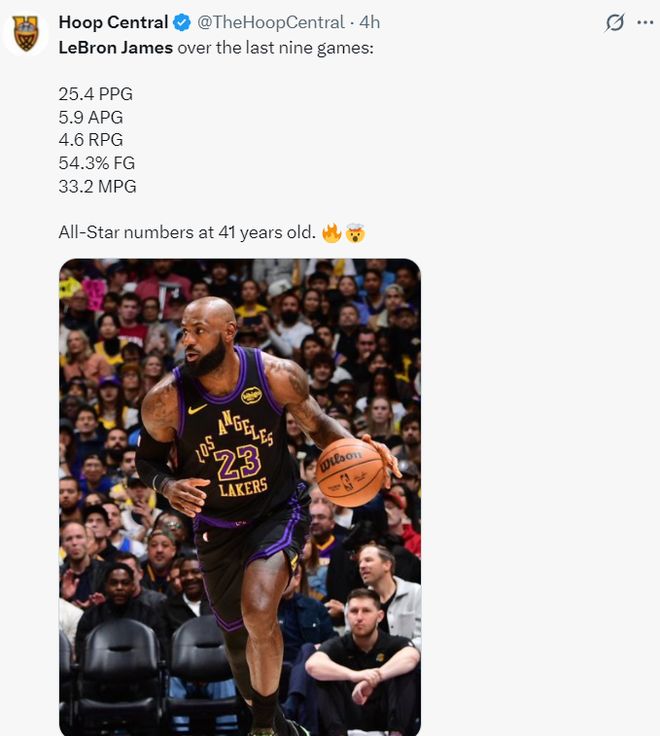 过去詹姆斯9场比赛,场均33.2分钟,拿到25.4分5.9助攻4.6篮板,命中率54.3%,美媒认为41岁的他还是有全明星水准。