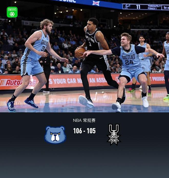 第四节灰熊凯姆-斯宾塞拿下13分,马刺凯尔登-约翰逊拿下8分,最终灰熊106-105战胜马刺