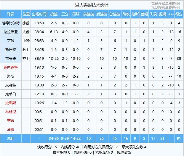 东契奇38分10板10助2断、拉拉维亚16分7板1助、海斯10分7板、艾顿9分6板1助、文森特6分2板2助、范德比尔特4分、史密斯3分1助、斯玛特2分7板1助3断、克内克特2分3板、克莱伯1分3板