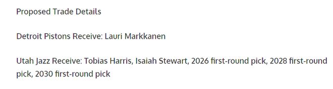 底特律活塞队本赛季成为东部的大黑马,战绩领跑东部,引进马尔卡宁将成为球队冲击季后赛乃至总决赛的关键一步。潜在的交易方案为:活塞送出托比亚斯·哈里斯、以赛亚·斯图尔特以及2026年、2028年、2030年三个首轮选秀权,从爵士得到马尔卡宁。